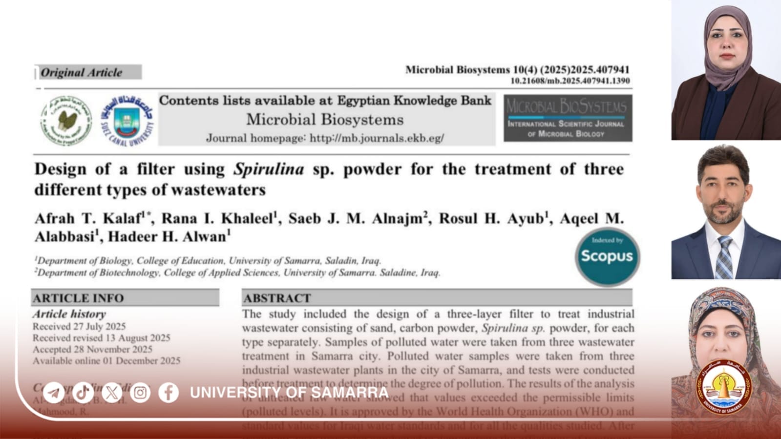 A research team at the College of Education for Pure Sciences, Samarra university, published a high-level joint research paper in the journal Microbial Biosystems, specialized in microbiology, issued in the Arab Republic of Egypt, and classified in the fourth quartile (Q4) in the Scopus database.