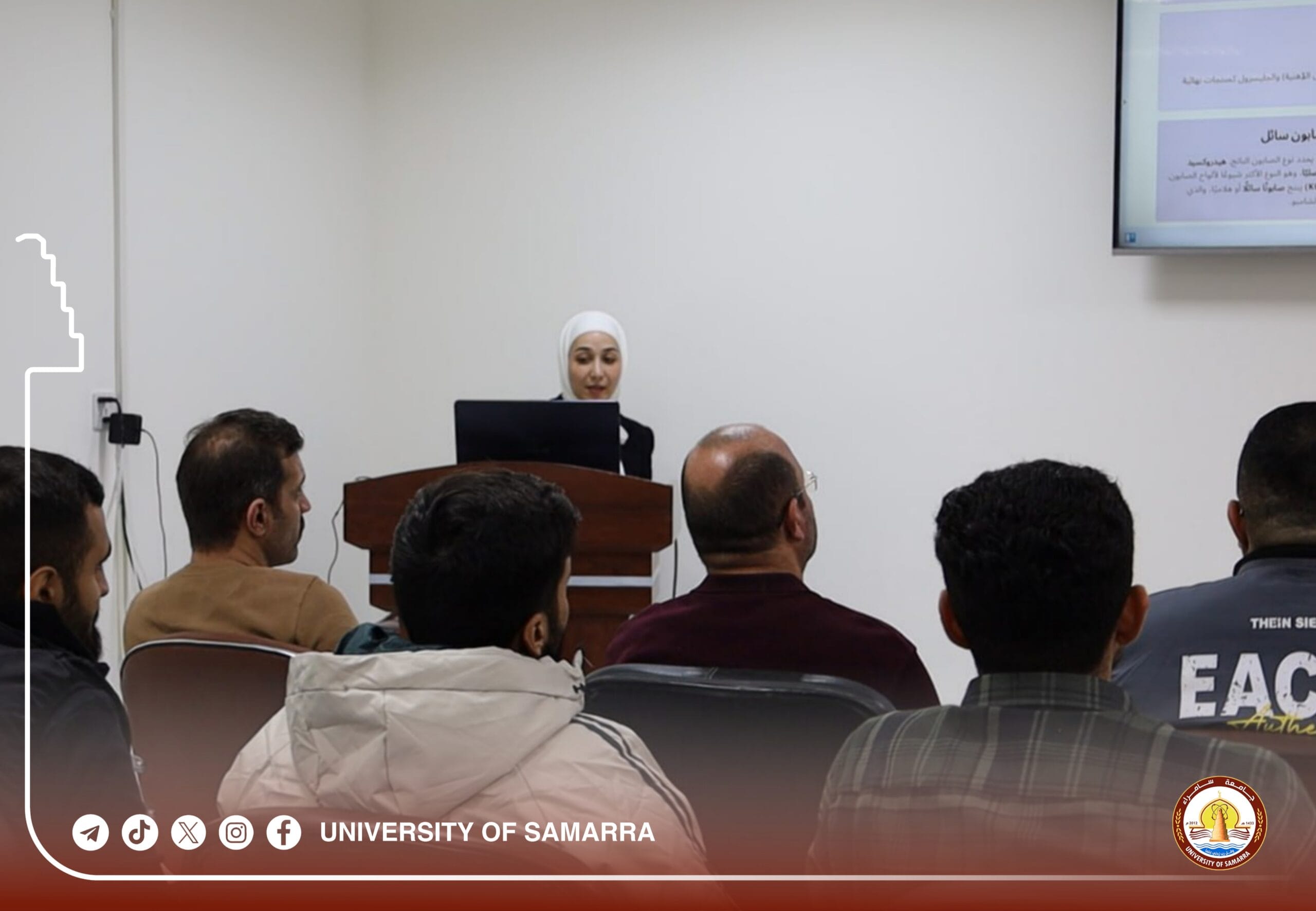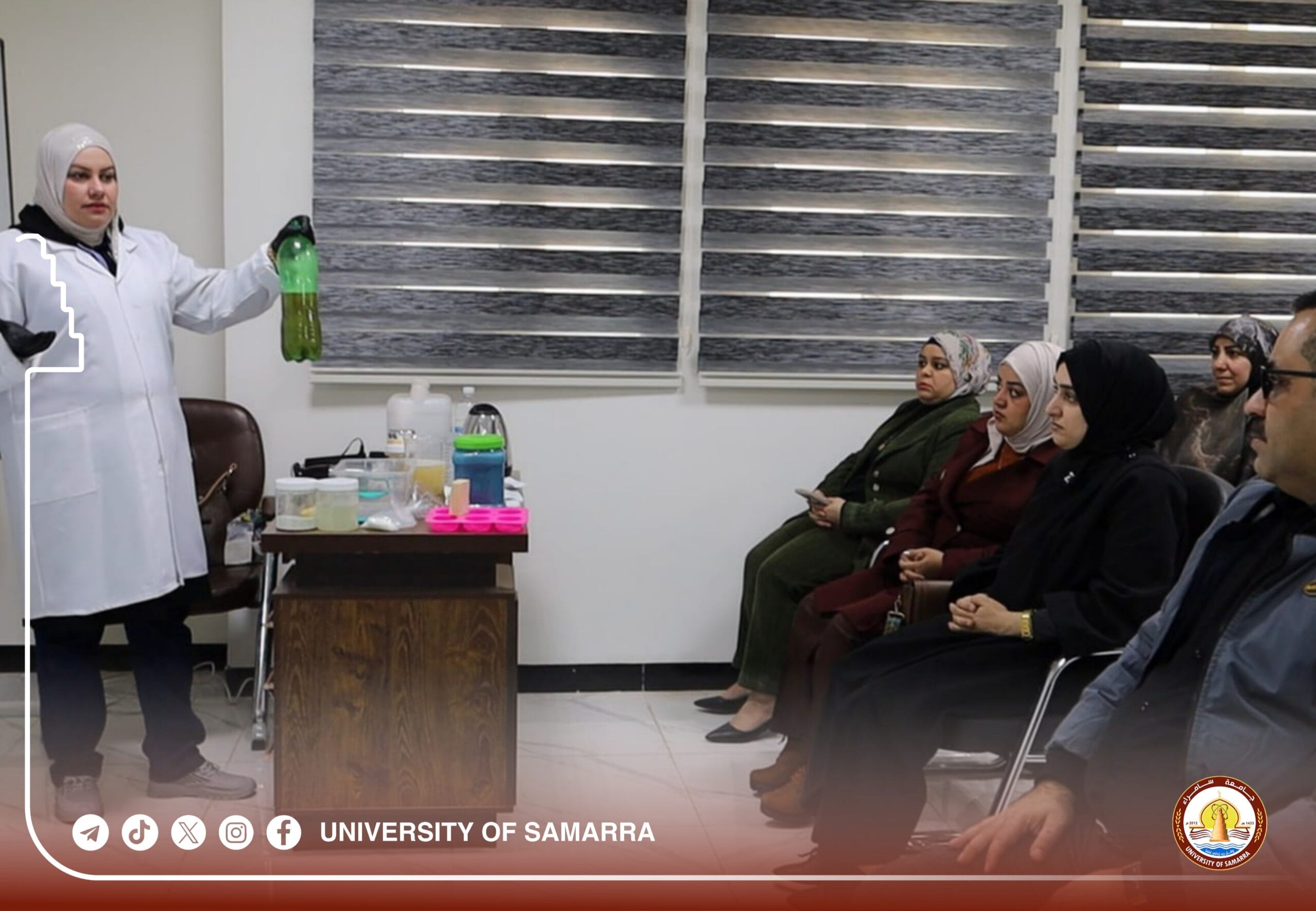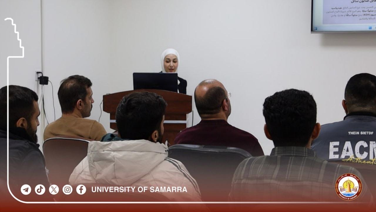 The College of Engineering at the University of Samarra organized a specialized training workshop titled “Converting Waste Oil into Effective Low-Cost Detergents.” The session was presented by Assoc. Prof. Dr. Zainab Abdul Majeed Khalaf (Department of Electromechanical Engineering) and Assist. Lect. Sahar Adnan Ahmed (College of Engineering, University of Tikrit).