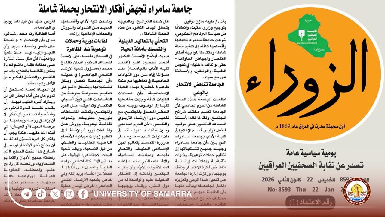The official government newspaper, Al-Zawraa, published a report on Samarra University\’s activities in combating suicide ideas in its issue No. (8593), published on Thursday, January 22, 2026.