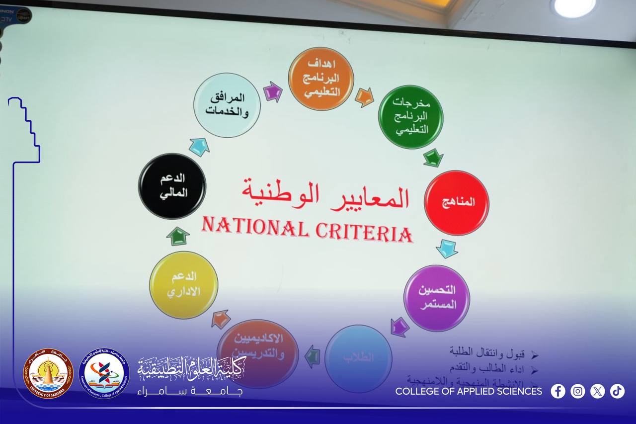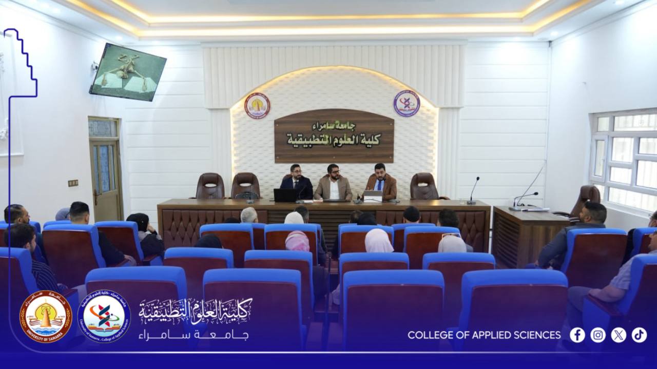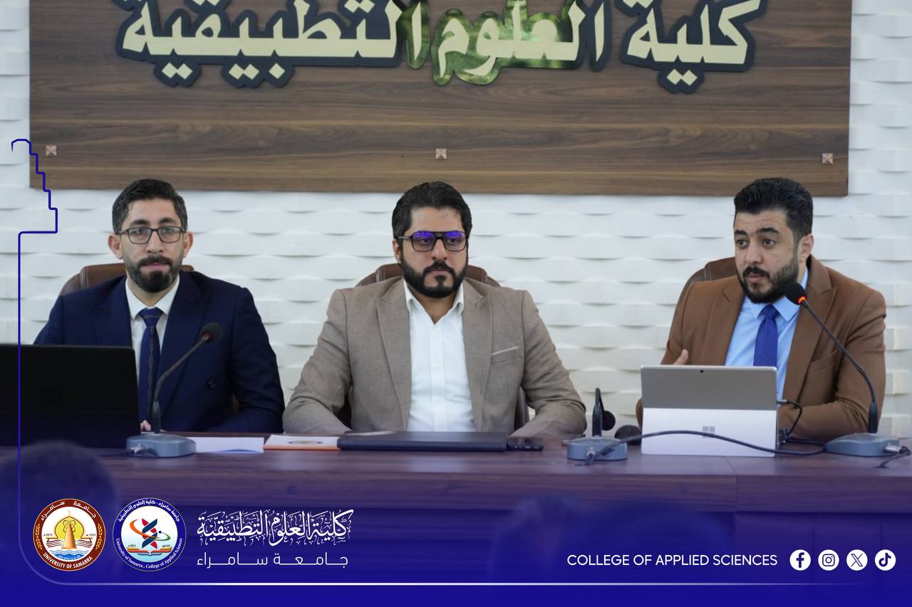 The Quality Assurance Division at the College of Applied Sciences, in cooperation with the Quality Assurance Department at the Presidency of the University of Samarra, organized a workshop entitled “National Standards for the Accreditation of Science Programs.” The workshop was delivered by Prof. Dr. Nashwan Hussein Ali, Asst. Prof. Dr. Shihab Ahmed Shawkat, and Asst. Prof. Dr. Mohammed Abbas Fadil.