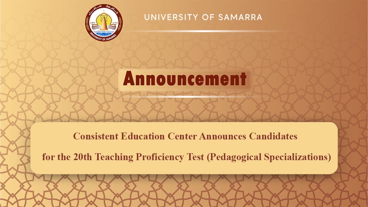 The Consistent Education Center at the Rectorship of the University of Samarra announces the names of candidates for the updated Teaching Proficiency Test (20th Session) for pedagogical specializations. The test will take place at 9:00 AM on Sunday, February 1, 2026.