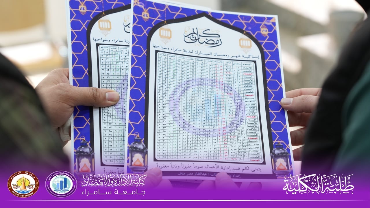 A number of students from the Department of Business Administration – Third Stage, at the College of Administration and Economics, University of Samarra, initiated a voluntary campaign embodying the spirit of generosity and social responsibility through the organization of a distribution drive for the Ramadan Imsakiyah for the year 1447 AH – 2026 CE, targeting university staff and students.