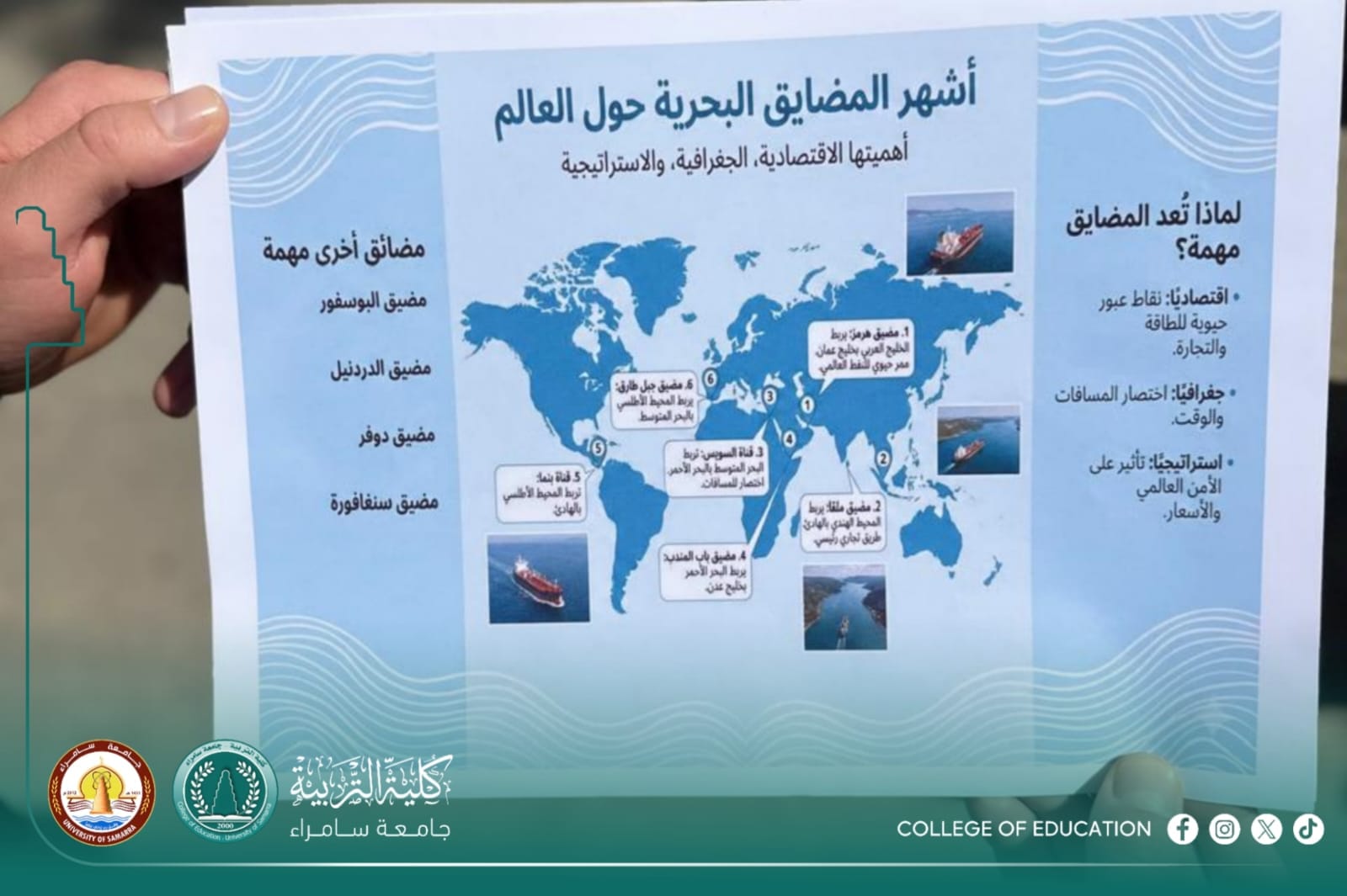 كما تضمنت الندوة توزيع كتيبات علمية أعدها الطلاب، تغطي المواضيع والمفاهيم الرئيسية المتعلقة بالمضائق البحرية، وذلك لدعم تعزيز معارف الطلاب وتقوية الجانب العملي للتعلم.