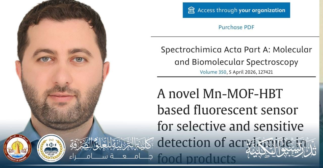 Dr. Bakr Ismail Ahmed, a faculty member in the Department of Chemistry at the College of Education for Pure Sciences – University of Samarra, has published a scientific article in the journal Spectrochimica Acta Part A: Molecular and Biomolecular Spectroscopy, issued by Elsevier, indexed in Scopus within the first quartile (Q1).
