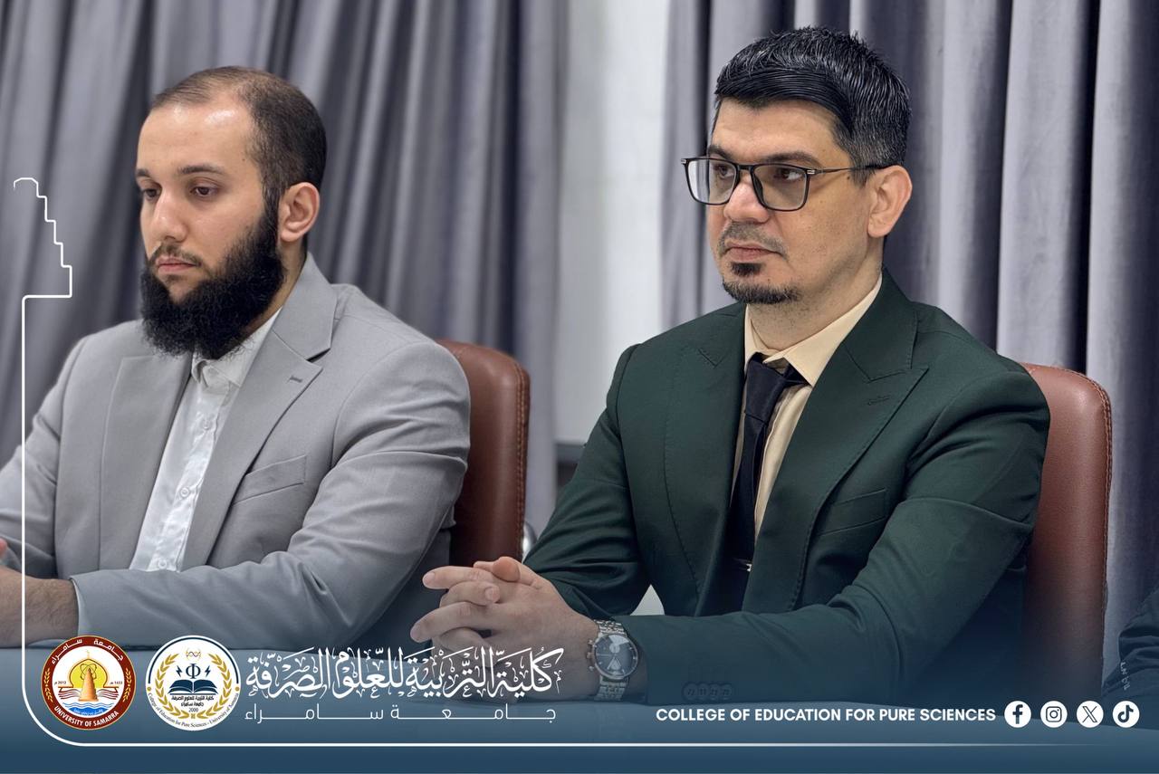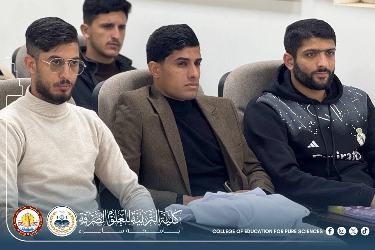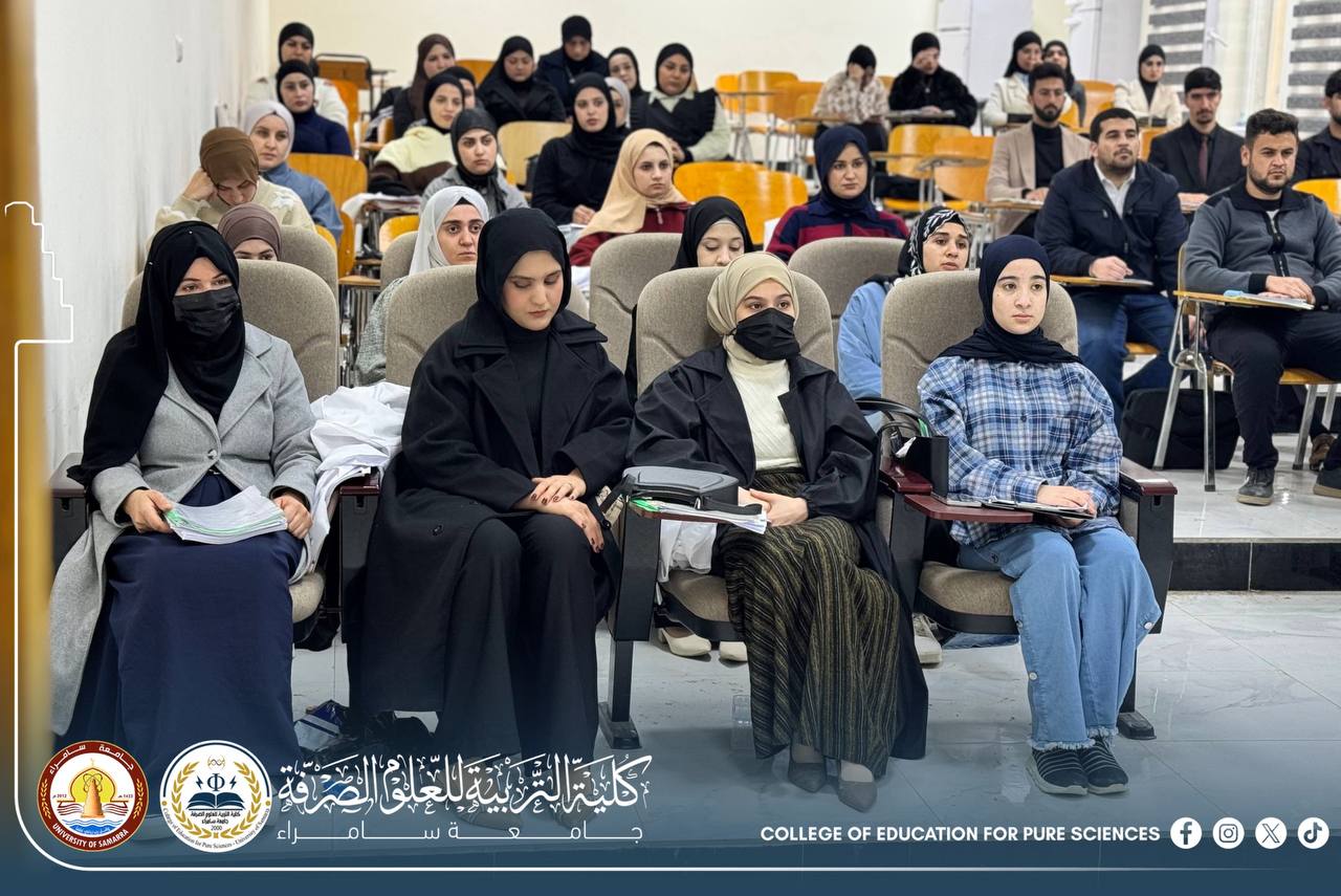 The Department of Chemistry at the College of Education for Pure Sciences – University of Samarra organized a seminar entitled “Excellence and Success as a Guide Toward Academic and Future Achievement,” presented by Assistant Lecturer Mohammed Daham Humaidi, alongside a number of graduate students.