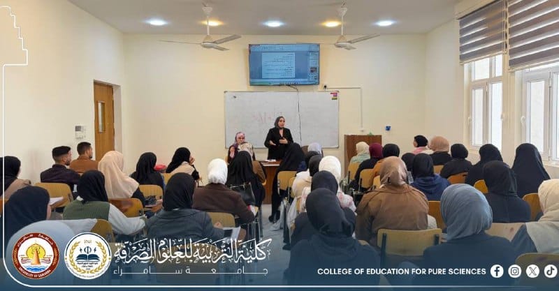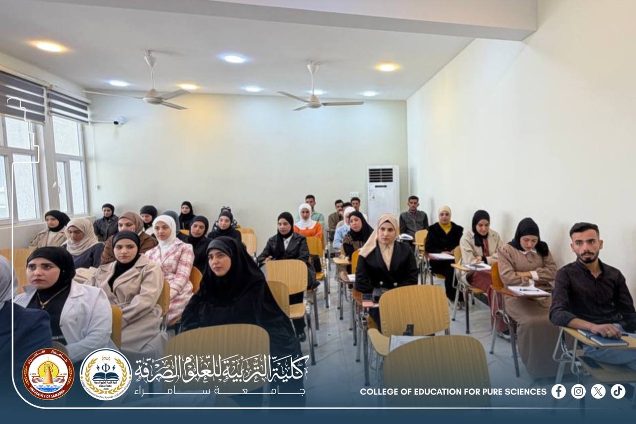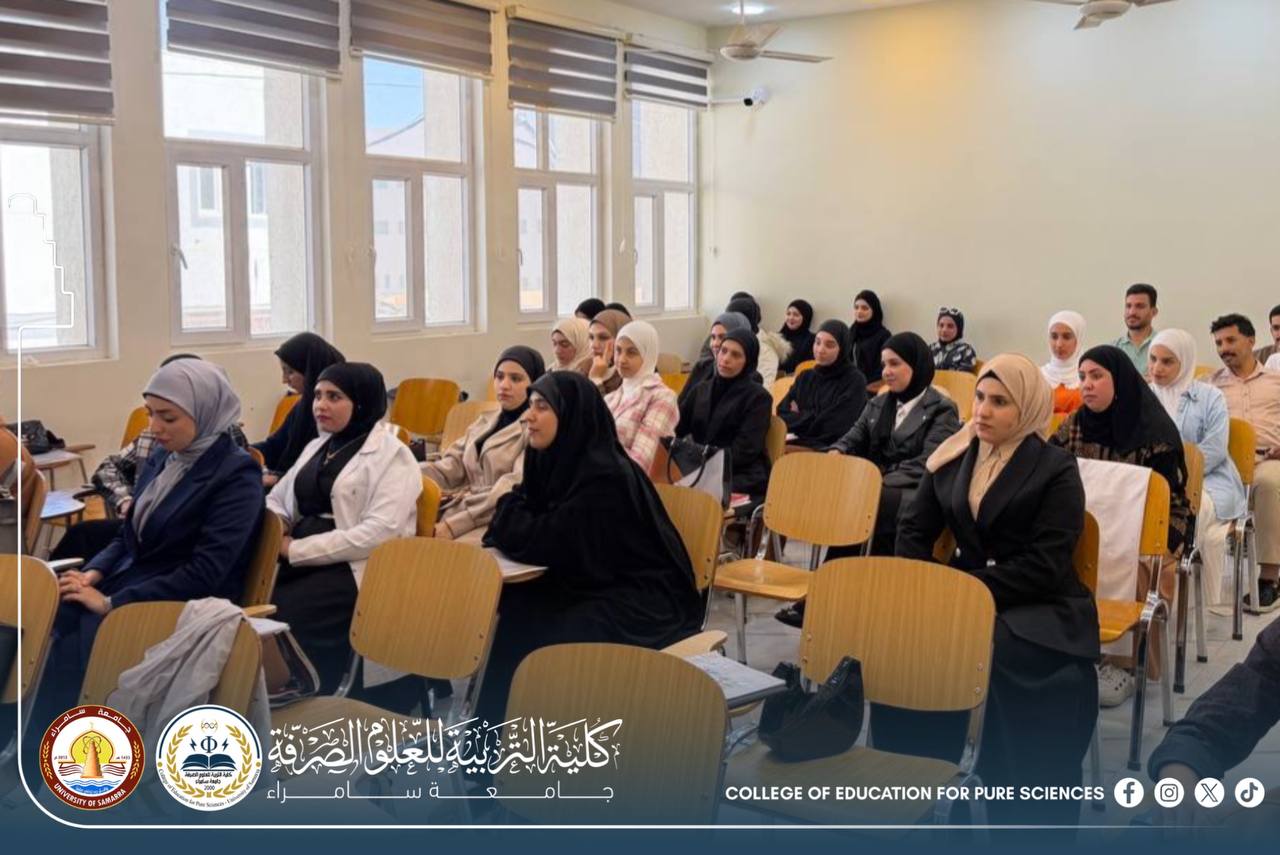 The Department of Life Sciences at the College of Education for Pure Sciences – University of Samarra organized a scientific seminar entitled “Bacterial and Fungal Toxins and Their Risks to Human Health.” The seminar was delivered by Assistant Lecturer Narjis Ali Zaidan and Assistant Lecturer Esraa Abdulmunim Yassin, and targeted undergraduate students.