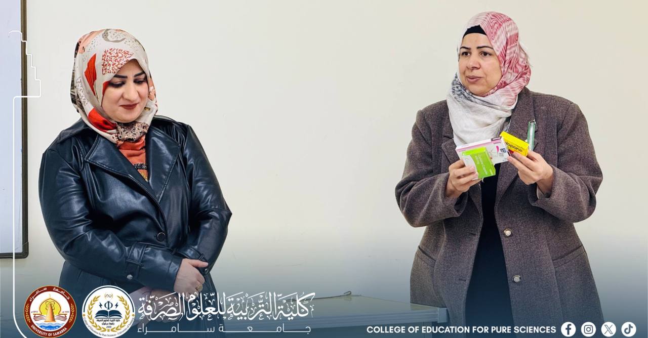 The Department of Chemistry at the College of Education for Pure Sciences, University of Samarra, organized a training course entitled “Antibiotics and Their Effects on the Liver and Kidneys”, presented by Assistant Professor Dr. Noha Ali Hadi and Assistant Professor Sarah Saad Mohammed Jawad.