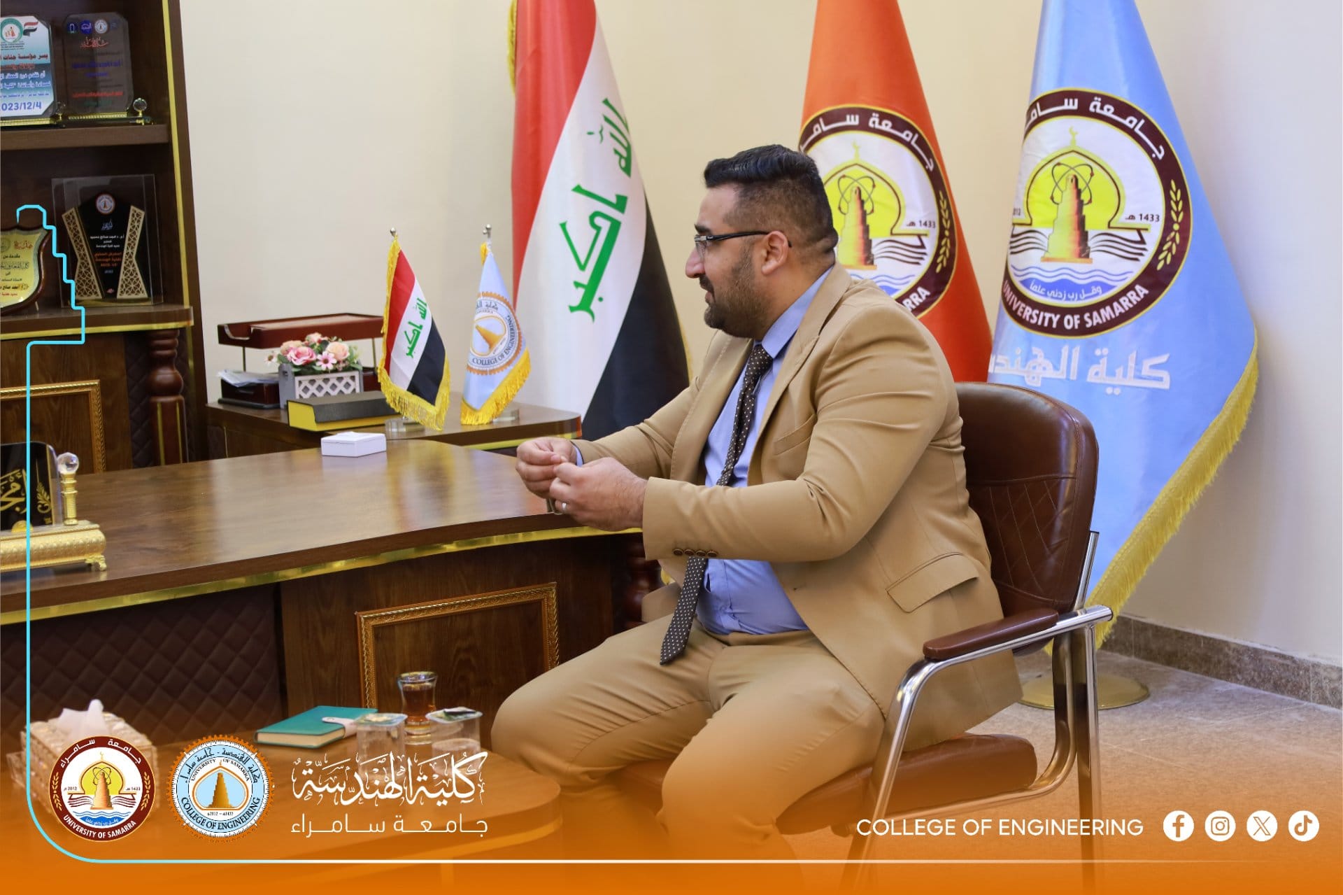 The Dean of the College of Engineering at the University of Samarra, Assistant Professor Dr. Amjed Saleh Mahmood, received Mr. Ahmed Jumaa Fadhil in his office this morning to celebrate the success of the Alumni Forum.