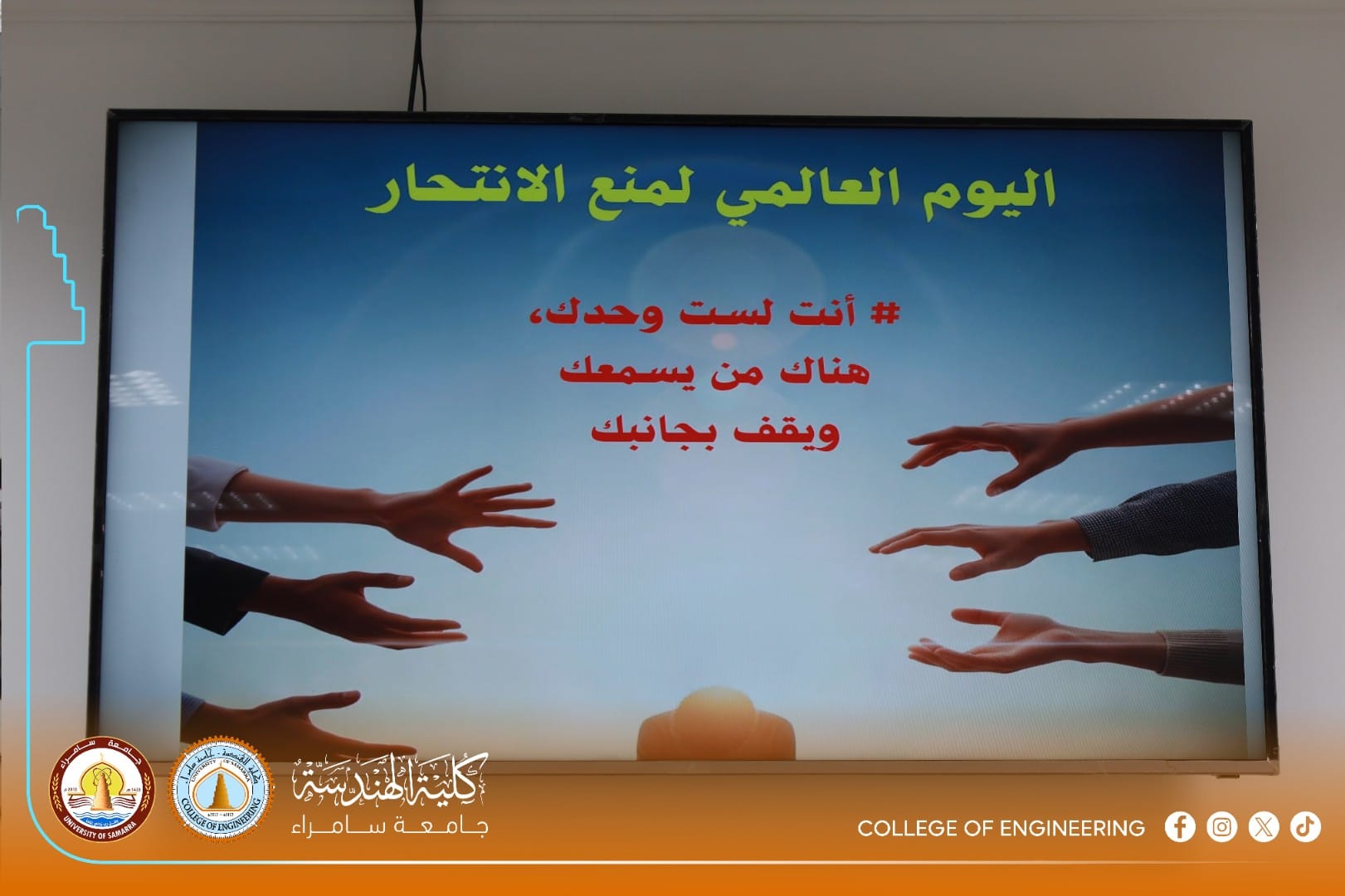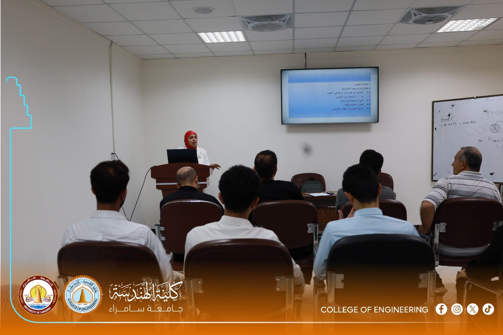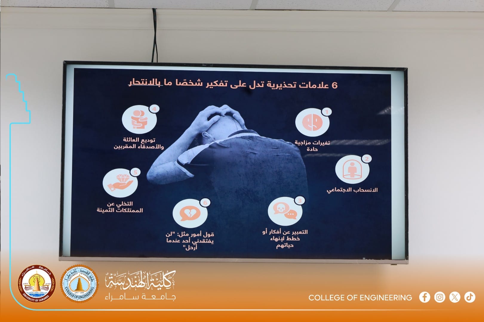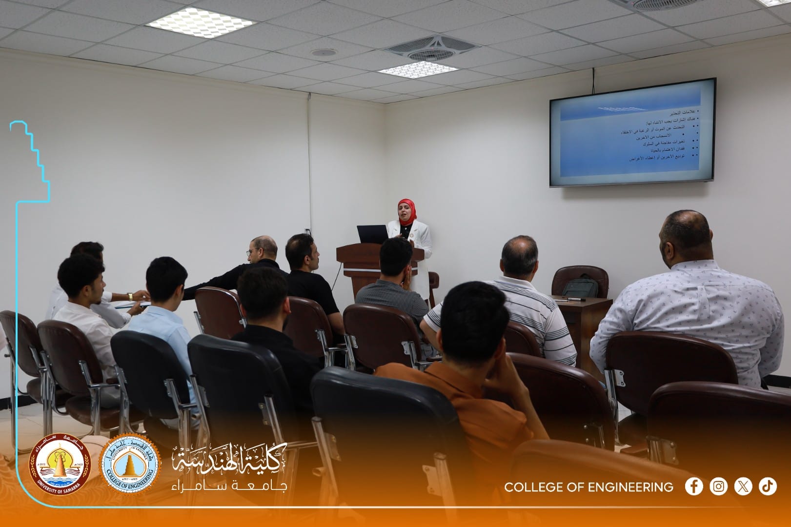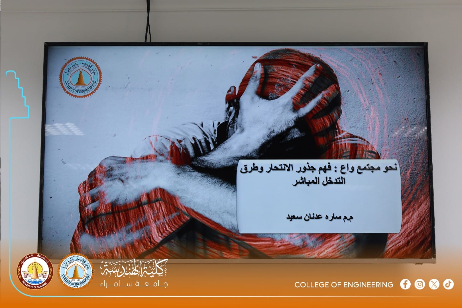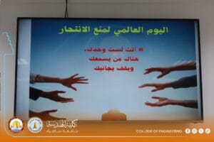 The University Psychological Counseling Unit at the College of Engineering, University of Samarra, organized an awareness workshop titled “Spreading Community Awareness on the Dangers of Suicide and Methods of Prevention,” presented by Assistant Lecturer Sarah Adnan Saeed, a faculty member in the Department of Civil Engineering.