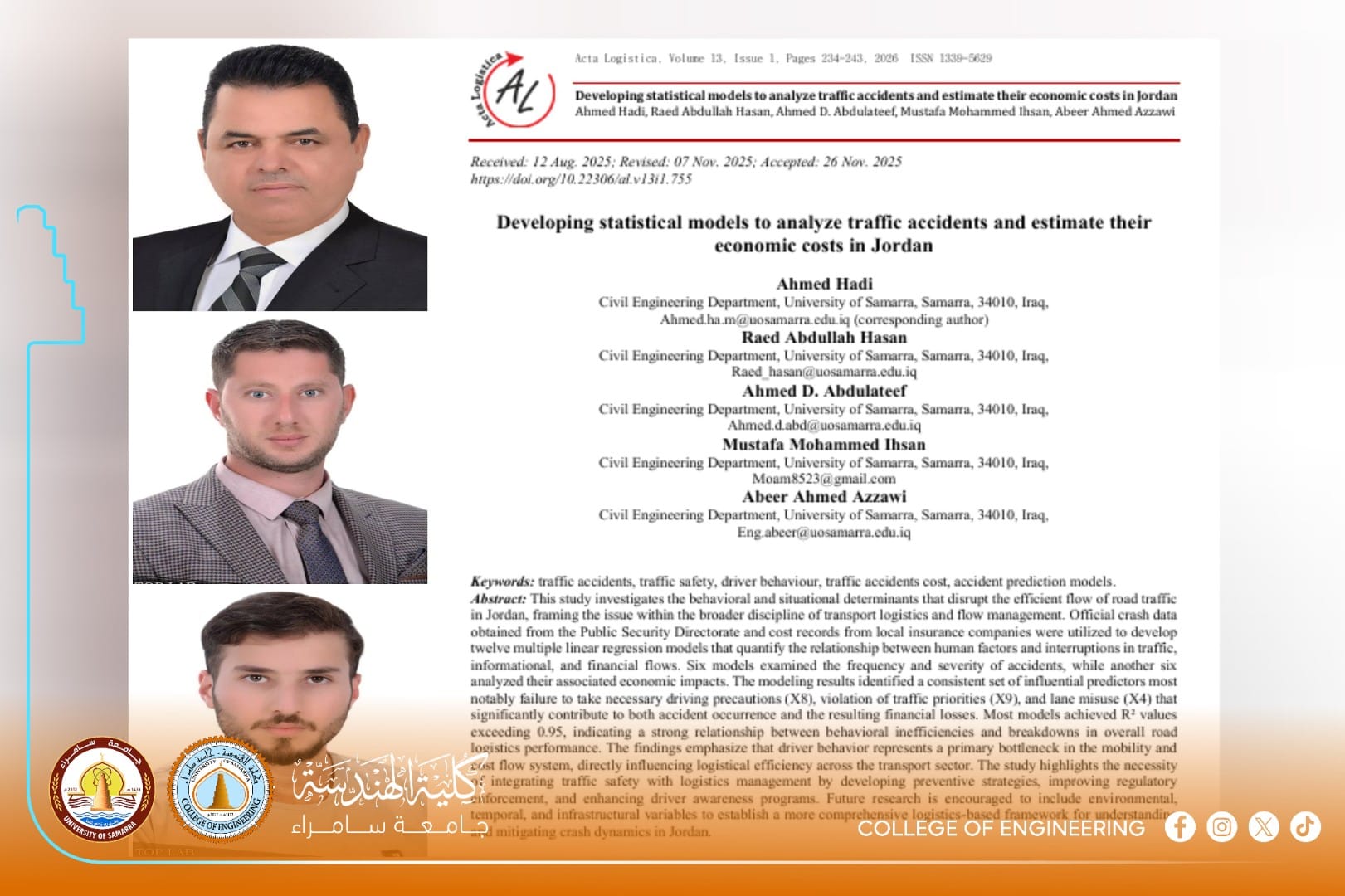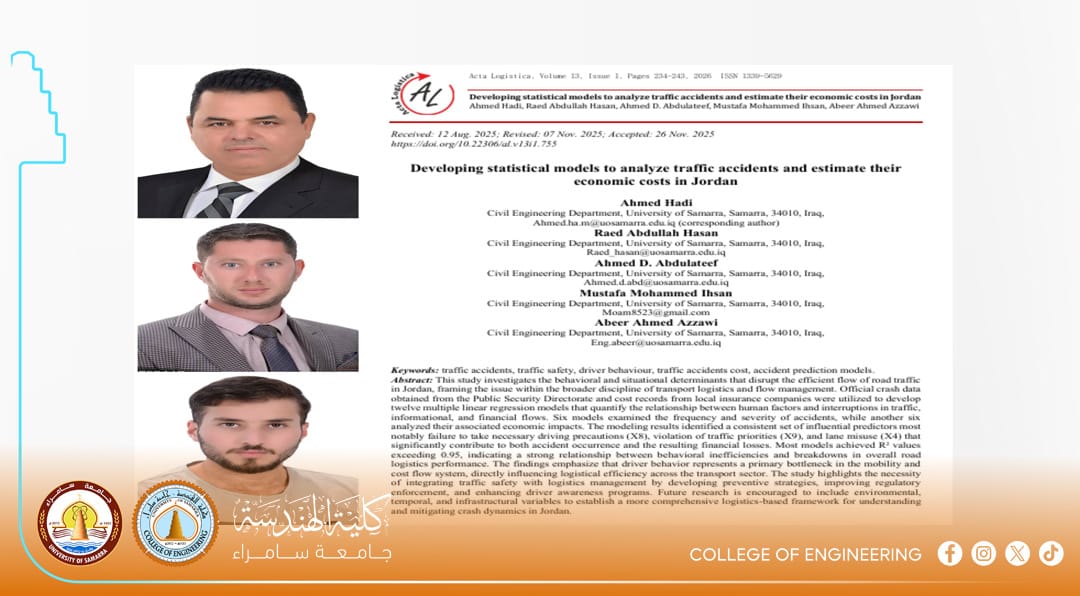 The faculty of the College of Engineering at the University of Samarra has achieved a new scientific milestone by publishing a specialized research paper titled “Development of Statistical Models for Traffic Accident Analysis and Estimation of Their Economic Costs in Jordan” in the international scientific journal (Acta Logistica). The journal is indexed within the Scopus and Clarivate databases (Q3). This achievement is the result of efforts by the research team consisting of Assistant Professor Dr. Raed Abdullah Hassan, Assistant Lecturer Ahmed Hadi Mahmoud, and Assistant Lecturer Ahmed Diaa Abdullatif.