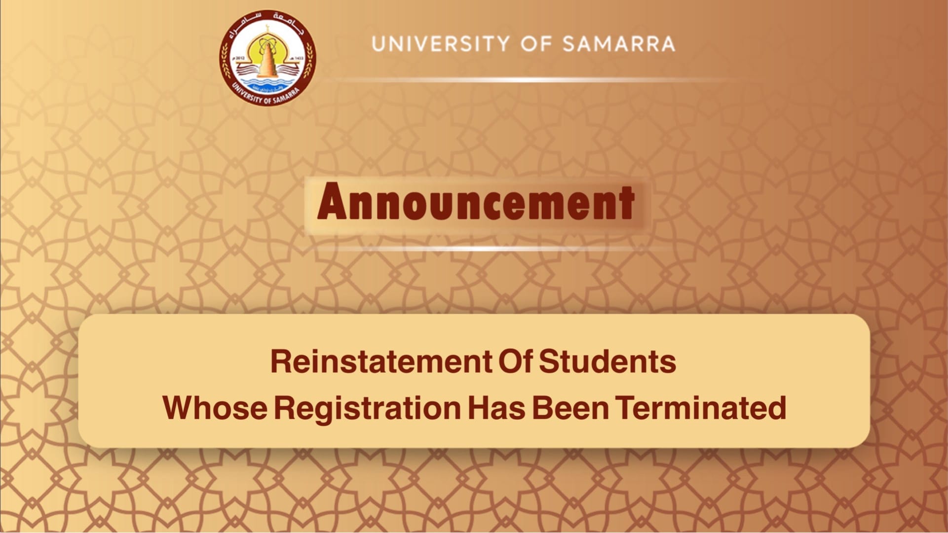 Therefore, we invite all postgraduate students in all the university\’s colleges whose registration has been terminated and who wish to return to their studies to visit the Department of Postgraduate Affairs at the University Rectorship , starting from Wednesday, April 1, 2026, until Wednesday, July 1, 2026; for the purpose of submitting applications and filling out the special pledge for reinstatement.