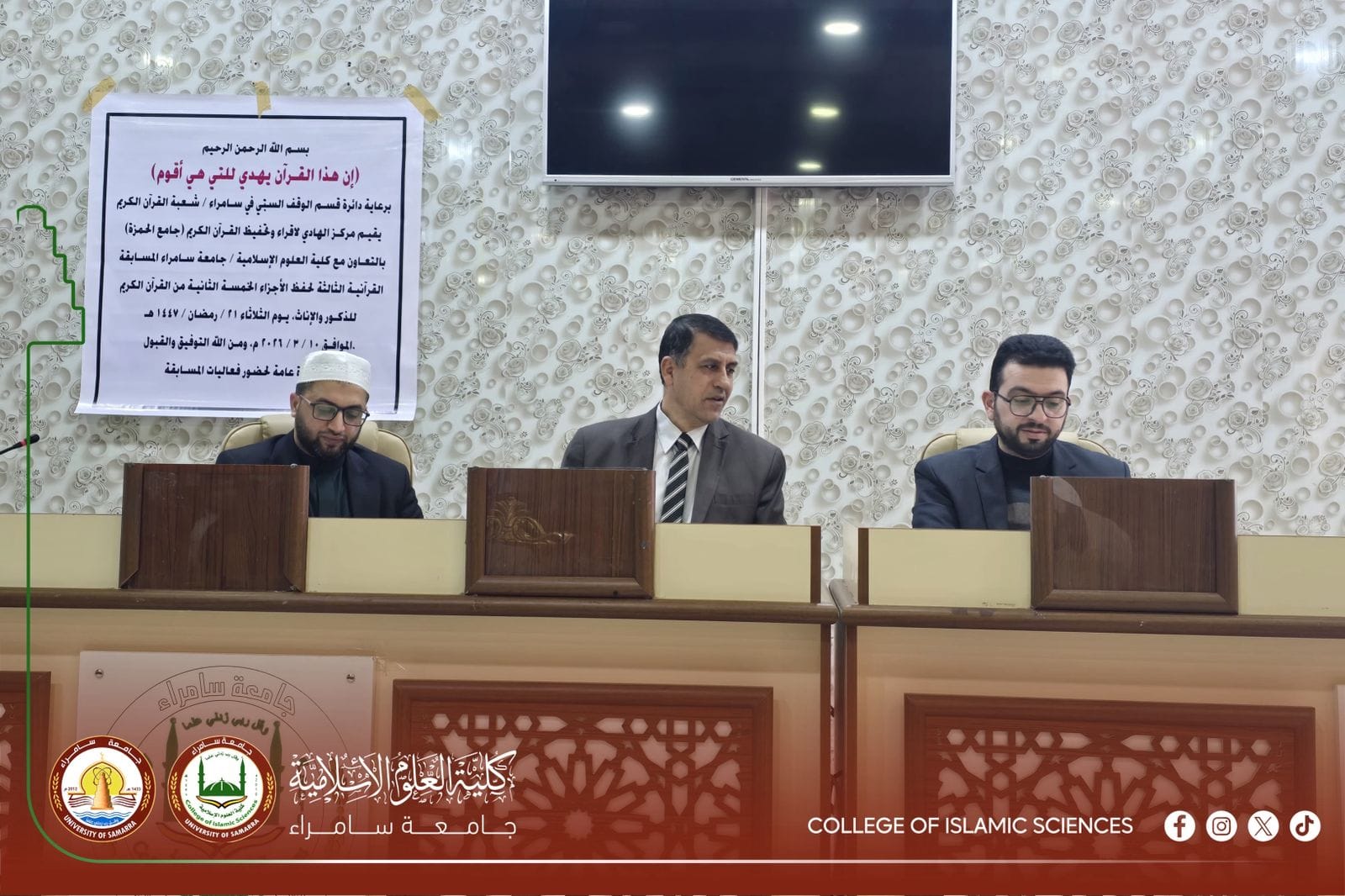 The College of Islamic Sciences at University of Samarra hosted the examinations for the Third Ramadan Qur’anic Competition, which was organized in cooperation with Al-Hadi Center for Qur’an Recitation and Memorization, with the participation of a number of male and female contestants interested in memorizing and reciting the Holy Qur’an.