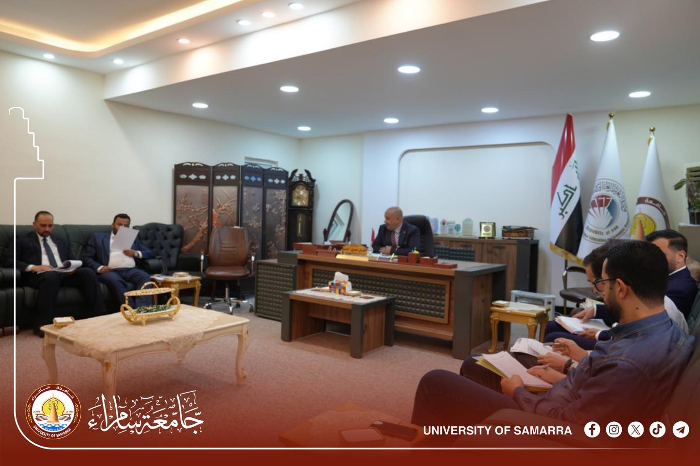 Professor Dr. Kamal Hussein Ahmed, Vice President of the University for Scientific Affairs, chaired an extensive meeting in his office, which included the Director of the Graduate Studies Department at the University Presidency and the Associate Deans for Scientific Affairs from the colleges. The meeting was held to discuss the Ministry’s regulations regarding study leave during employment and to identify eligible university staff for such leaves.
